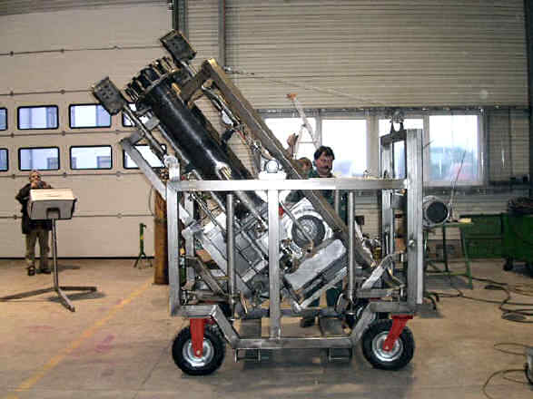 The image shows a mobile flare, installed at a handcart during lifting from horizontal to vertical position. The tip is